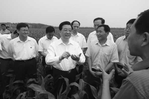 图为胡锦涛在绥化肇东市五里明镇高产玉米田里同农民和农技人员亲切交谈,鼓励他们建设好优质高产良田,为使黑龙江成为国家可靠的大粮仓多作贡献。