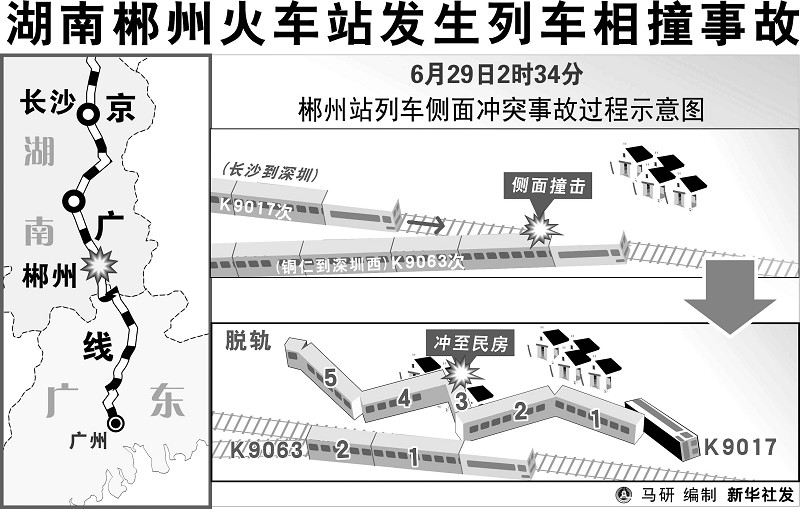 新华社6月29日电29日2时34分,京广铁路湖南境内郴州站发生一起客车侧面冲突事故,目前已造成3人死亡,60余人受伤。