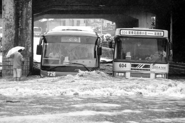 六月三十日,武汉市区道路积水严重,车辆在水中行驶犹如行舟。近日来,武汉连降暴雨,造成市区严重积水,给城市交通和市民生活造成较大影响。(新华社发)