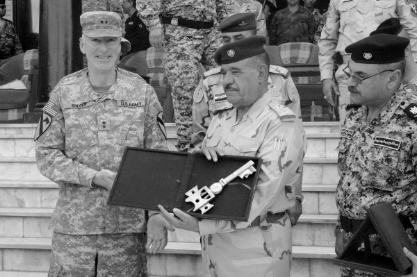 6月29日,巴格达美军指挥官丹尼尔·博尔格少将(左一)在美伊军队举行的巴格达城安全控制权交接仪式上,将一把象征性的铜钥匙交给巴格达伊军指挥官阿布德·甘巴尔(中),象征着美军把巴格达城安全控制权交给伊安全部队。按照协议,驻伊美军战斗部队应该在6月30日最后期限前全部撤出伊拉克城镇。 (新华社发)