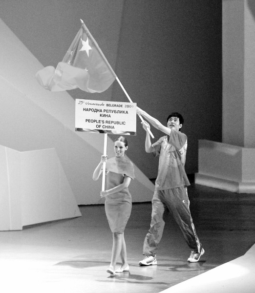 为期12天的贝尔格莱德大运会吸引了来自145个国家及地区的8500多名运动员,他们将参加田径、游等15个大项的201个小项比赛。中国代表团由438人组成,将参加全部15个大项中198个小项的比赛。图为中国代表团旗手入场。