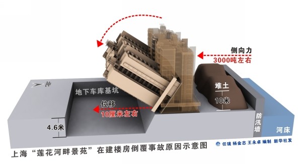 新华社7月3日电 上海市政府3日召开新闻发布会宣布,上海“莲花河畔景苑”在建楼房倒覆事故的主要原因是,楼房北侧在短期内堆土高达10米,南侧正在开挖4.6米深的地下车库基坑,两侧压力差导致过大的水平力,超过了桩基的抗侧能力。