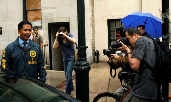 7月2日,在美国纽约麦道夫被查封的公寓前,美国联邦执法部门工作人员(左)对媒体讲话。美国联邦执法部门当日查封了金融巨骗麦道夫位于纽约曼哈顿价值700万美元的公寓。 (新华社发)