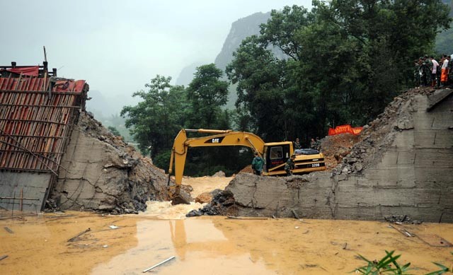 7月5日,施工机械在疏导大坝泄洪槽口。当日17时33分,广西罗城仫佬族自治县卡马水库开坝泄洪。连日来的持续强降雨引发卡马水库水位上涨,险情严重。