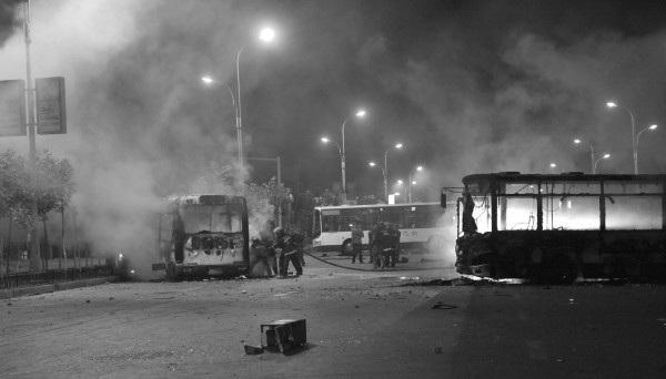 图2为:在乌鲁木齐市大湾南路的跑马场地段,多辆公交车被烧毁,消防官兵赶到现场救援。