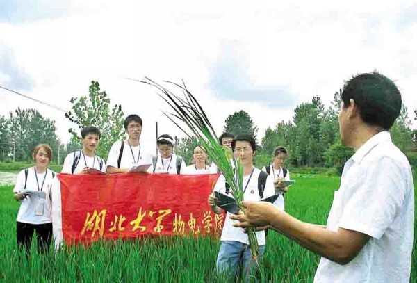 昨日,湖北大学学生来到曾都区安居镇范家岗村,开展以“关注家电下乡,推进新农村建设”为主题的暑假社会实践活动。图为湖大学子深入田间地头调查了解农村经济收入状况。 (本报记者 杨闻名摄)