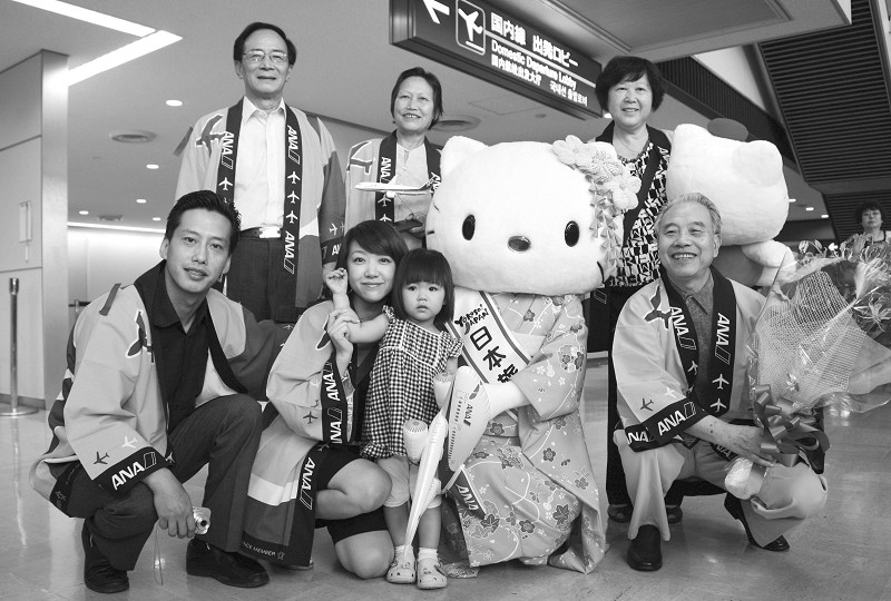 7月8日,首批中国赴日“自由行”旅客抵达日本东京附近的成田机场,在机场迎接的日本观光旅游大使凯蒂猫与游客们合影。当日,中国首批赴日“自由行”旅客抵达日本。为吸引更多的中国游客赴日旅游,日本从今年7月1日开始向中国个人游客发放旅游签证。 (新华社发)