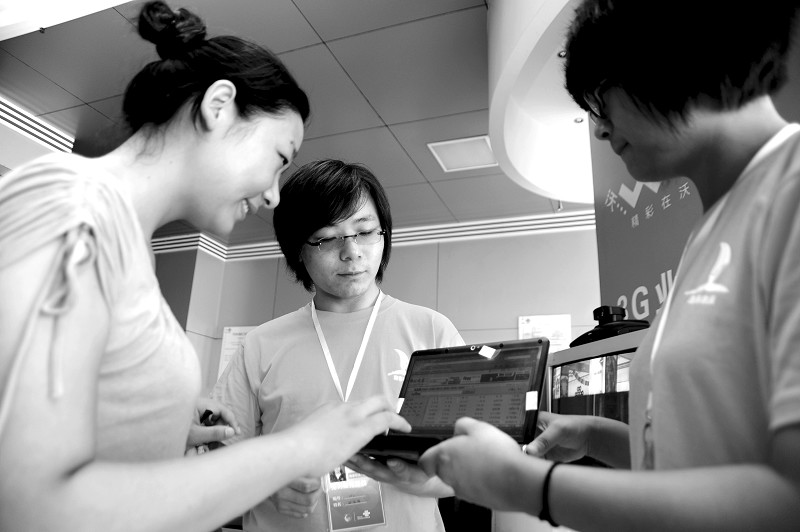 7月8日,随州职业技术学院参加暑期社会实践活动的大学生,在随州联通公司营业厅,向客户展示和操作WCDMA3G上网本,快速浏览网页和网上看电影。