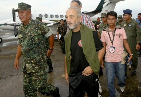 7月12日,在菲律宾三宝颜市的一个军用机场,获释的意大利籍红十字会工作人员欧金尼奥·瓦尼(中)在菲军方人员的陪同下走下飞机。当日凌晨,遭菲律宾阿布沙耶夫武装人员绑架6个月的意大利籍红十字会工作人员欧金尼奥·瓦尼获释。今年1月15日,红十字国际委员会的3名工作人员在菲南部霍洛岛遭武装人员绑架。和瓦尼一起遭绑架的另外两名工作人员已于4月获释。(新华社发)
