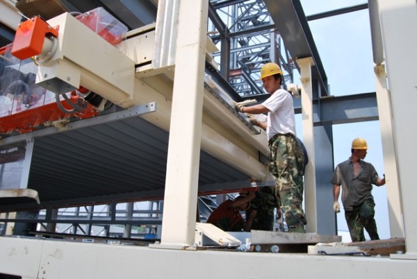 连日来,曾都区重点建设项目中盐银港建设工地一派火热建设景象,工人们战高温,斗炎热,加紧安装调试设备,力争十一投产。图为从德国进口的全套连续平压设备正在安装中。 (本报记者 唐天才 特约记者 程舢摄)