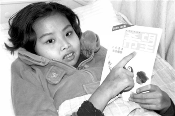 下左图:在陈汉青等众多好心人的帮助下,黄金玲的病情现在已基本稳定。病床上的黄金玲指着杂志上“希望”两个字,对未来充满着向往。