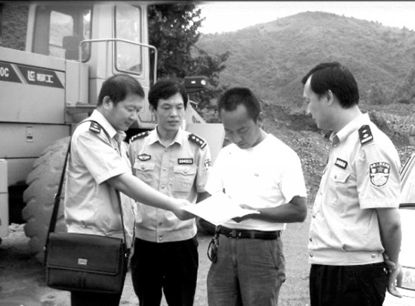 为迎接新中国成立六十周年,大洪山景区公安分局及早着手做好辖区的维稳工作。前不久,该分局对辖区的矿山以及易燃易爆的场所进行了清查。图为分局干警向一磷矿送达安全责任书。(黄朝恩 摄 简玉新 文)