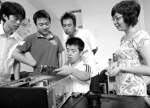 7月16日,江苏省泰州市残疾人程骏(中)和他的妻子黄松花(右一)向公司新来的大学生传授电脑维护技术。
