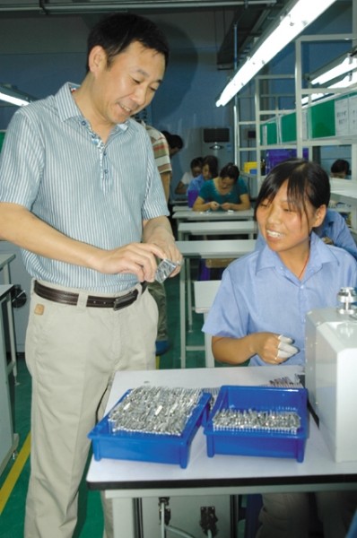 湖北方正能源实业有限公司,是回归创业的高科技企业。今年3月份正式投产以来,标准化、规范作业(上图),显示出企业的朝气和活力。产值和产量达到了预期目标。抓管理、促进度、保质量,是他们成功的关键,占职工总数70%的是返乡农民工,公司副经理施从朗(左图)经常巡视在车间的岗位上。