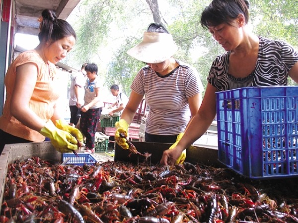 昨日,城区南郊转盘处龙虾销售点,经销人员在挑选本地产龙虾。据该销售点蔡女士介绍,每天有数吨龙虾销往武汉、四川、北京等市场。 (本报记者 杨闻名摄)