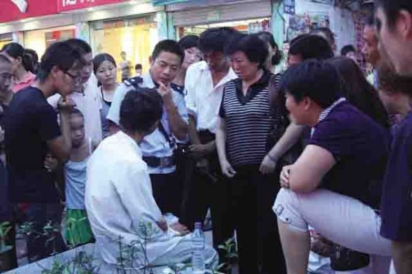 昨晚10时30分,曾都公安分局接到110指挥中心指令称,在解放路有一名少年晕了过去 (如图)。记者现场看到,该少年神情恍惚,正坐在一花坛上,衣服脏兮兮的,面色苍白,一语不发,好心市民为少年送馍馍、矿泉水和钱。经民警询问得知,少年家住曾都区三里岗镇某村,来随州一星期未找到工作。当晚,民警将少年送回了家。(本报记者 杨闻名摄)