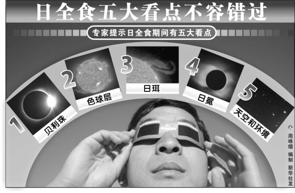同时,日全食发生时,人们往往有驻足观看的习惯,这也可能导致交通拥堵甚至事故的发生。因此,有关部门除了要引导人们前往预设的观测点并维护现场治安秩序之外,还要在日全食时段内,加强监督,防止车辆、行人在机动车道上临时停留观看。