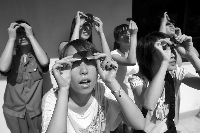 中国境内出现日食景观,众人竞相欣赏,一睹天象奇观。