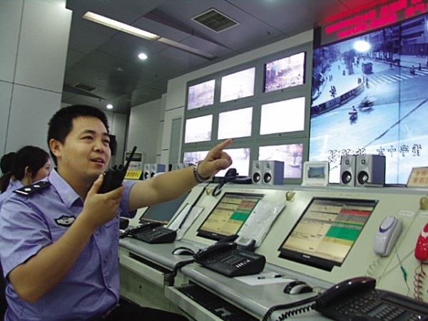 市公安机关重视信息化建设,提高了打击违法犯罪能力。图为市公安局110指挥中心民警正在城区视频智能监控系统前,通知路面执勤民警处置警情。