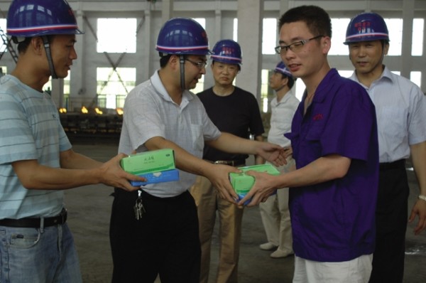 七月二十一日,市质量技术监督局局长杜洪顺一行,将五百公斤西瓜、几百盒清凉油等防暑降温用品,送到湖北全力铸造有限公司,慰问在高温下坚持生产的一线职工。(本报记者 陈德友 摄)
