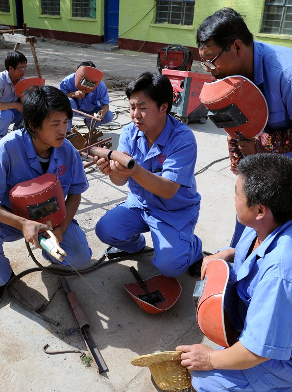 曾荣获 “中国十大杰出志愿者”“全国优秀农民工”等称号的宁夏回族自治区农民郭昊东,7年前走出大山进城务工致富后,依托宁夏总工会在家乡农村投资创办了“工字号”创业示范基地。目前已为家乡培训农民工近千人,向广东、北京、山东等地输出青年农民技工300多人。图为郭昊东(中)在创业示范基地给当地农民培训电焊操作技能。