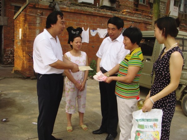 曾都区西城办飞来土社区居民、下岗职工刘涛 (左一)5岁女儿身患钙骨沉积不全(俗称玻璃人)重病,已花费10余万元,家中十分困难。近日,西城妇联、计生、民政和飞来土社区等单位负责人,来到刘涛家中看望,并送去3000余元慰问金和食用油、大米、面粉等物资,表达一片爱心。 (本报记者 唐天才 通讯员 刘开林摄)