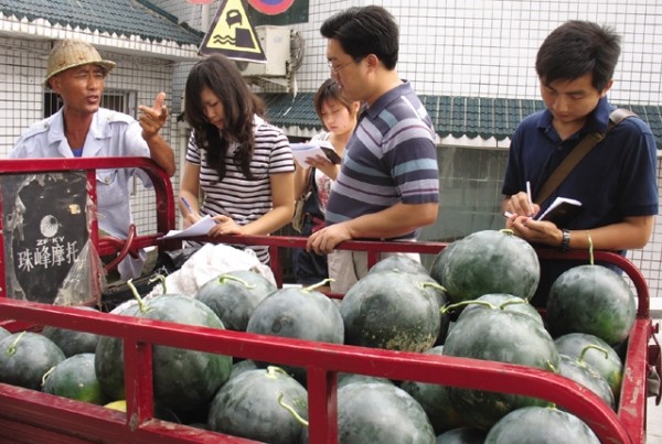7月25日,在外求学的部分随州籍大学生在本报记者指导下参加暑期社会实践活动。他们针对夏日随城瓜果市场进行调查采访。(本报记者 杨闻名摄)