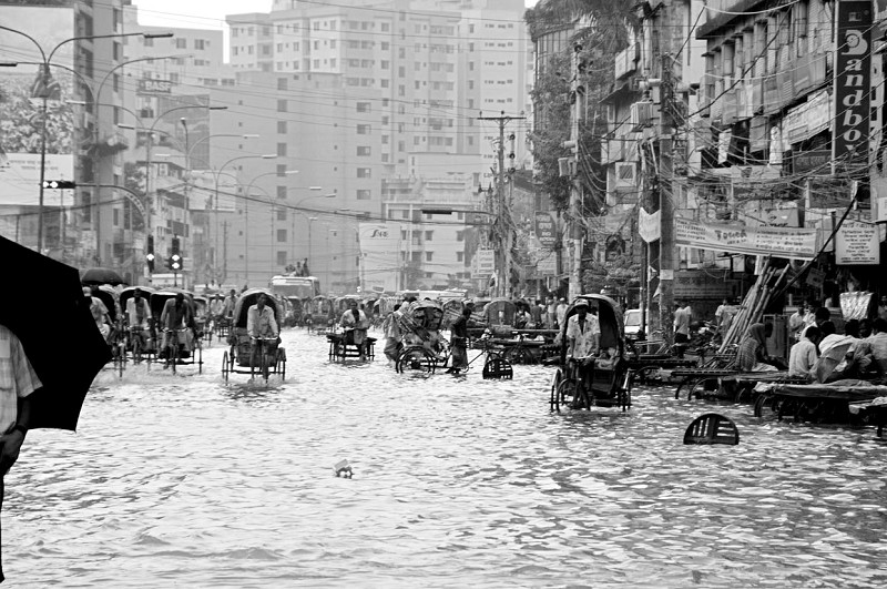 这是7月28日在孟加拉国首都达卡拍摄的被洪水淹没的街道。连夜强降雨导致达卡城区洪水泛滥,据当地气象机构记录,达卡28日凌晨至早上7时的降水量达333毫米。 (新华社发)