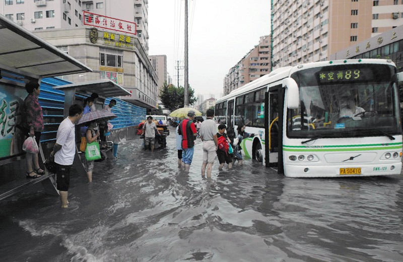 目前强雷暴云团已明显东移并减弱,上海中心气象台已于30日16时25分解除雷电黄色、暴雨红色以及大风黄色预警信号。预计30日夜里到31日受高空浅槽以及低层弱切变线影响,上海为多云到阴有时有阵雨或雷雨天气。从8月1日起,气温逐步回升,最高气温在32摄氏度左右。上图为上海市斜土路靠近小木桥路一公交站点,齐膝的积水给路人带来诸多不便。