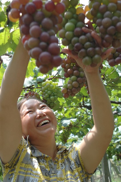 随县尚市镇葡萄生产又获大丰收,该镇太山村的3900亩葡萄预计总产可达到1200万公斤,全村葡萄总收入可达2800万元。左图:农民正在采摘葡萄。