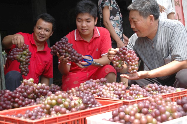 上图:今年该镇十分注重葡萄品质,采取系列科学种植手段,使今年的葡萄果实大,外形好看,经销商前来收购时爱不释手。 (本报记者 陈德友摄)