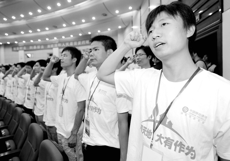 7月31日,即将赴任的大学生们在培训结业式上宣誓扎根基层,做出成绩。当日,湖北省第二批选聘到农村任职的865名高校毕业生结束培训,开始奔赴该省各地的村级岗位,开始他们的“村官”任职。 (新华社发)