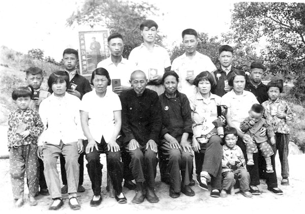 ▲1968年,邹守明(后排左二)一家三代人的全家福。当时,手捧红宝书,悬挂毛主席画像是照相时必备的程序。