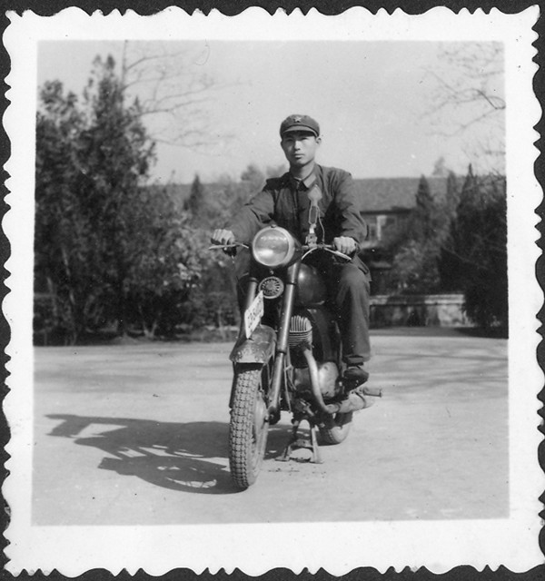 ▲1977年,时任某师侦察连班长的邹守明骑着部队里的摩托车。