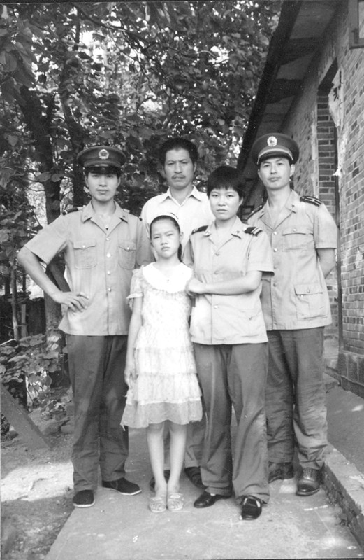 ▲1991年,邹守明(右一)和叔叔(一退伍老兵)、弟弟、妹妹、女儿合影,难得的是四人全部都是军人。兄弟姐妹三人穿军装的合影至2009年仅此一张。