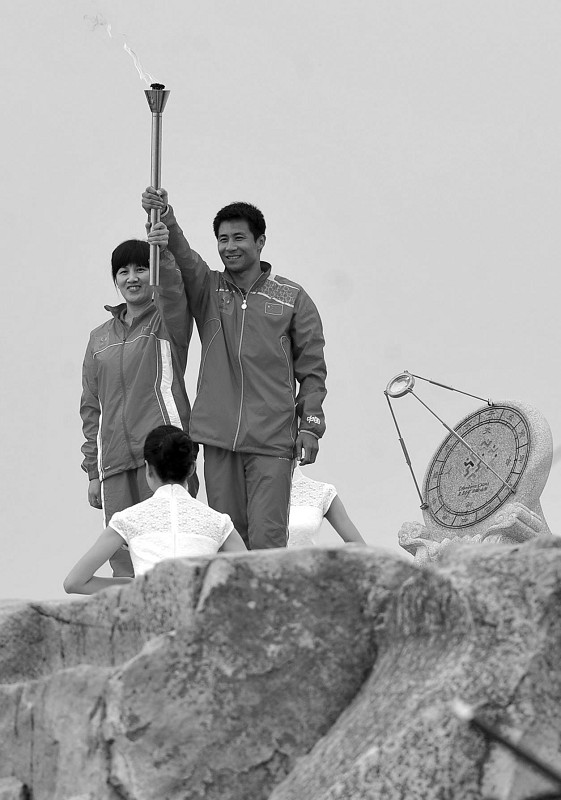奥运冠军王峰(右)和张娟娟共同高举手中的“如意”火炬。