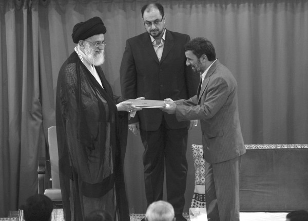 8月3日,在伊朗首都德黑兰,伊朗最高领袖哈梅内伊正式批准艾哈迈迪-内贾德为伊朗第10届总统。这是哈梅内伊(左)当天向艾哈迈迪-内贾德(右)颁发总统委任函。