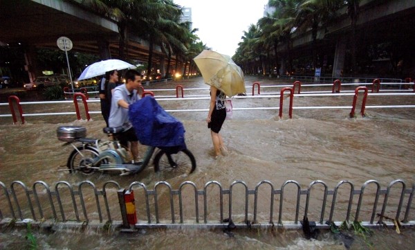 八月六日,行人在海口市区街道涉水行走。当日,今年第七号热带风暴“天鹅”,给海南省海口市带来强降雨天气。海口大部分主干道积水严重,海口市排水管理所的所有工作人员,已经出动到路面进行排水。海南省气象台六日七时八分发布了暴雨橙色预警信号。(新华社发)