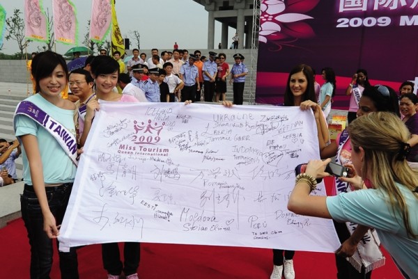 国际旅游小姐在赠送给我市的会旗上签名留念