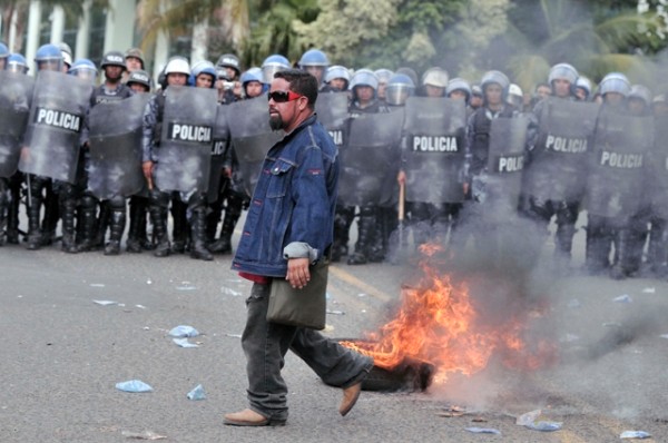 右图:8月11日,在洪都拉斯首都特古西加尔巴,一名参加示威活动的男子走过正在警戒的军警。(新华社发)