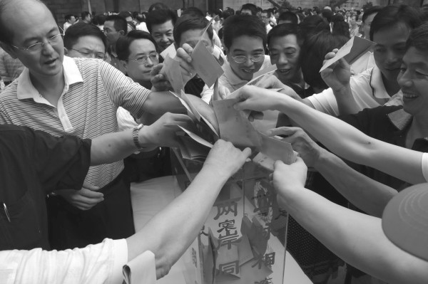 福州各界群众在向台湾受灾同胞踊跃捐款。(新华社发)