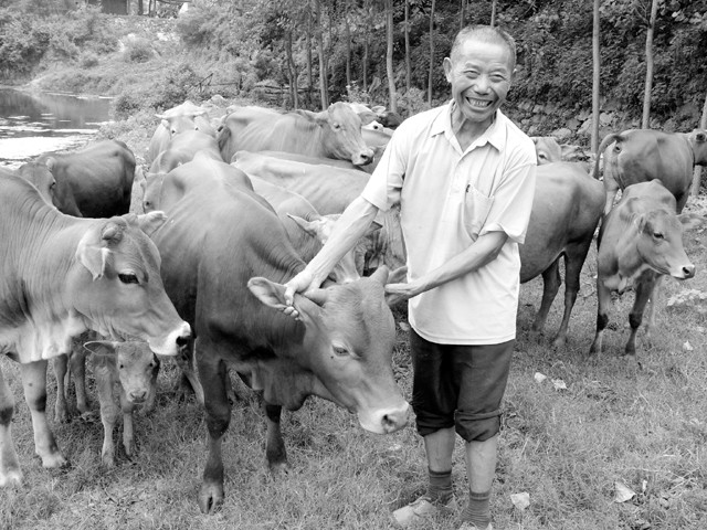 广水市吴店镇芝麻湾村四组村民兰中富在市老促会扶持下,科学养牛奔富路。他抚摸着自己的黄牛说:“我养了二十多头牛,年纯收入一万多元,全托市老促会搞品改的福。”现在全村养黄牛一千五百多头,据了解,如今成了农民致富的宝贝疙瘩。(石守京 张清 摄)