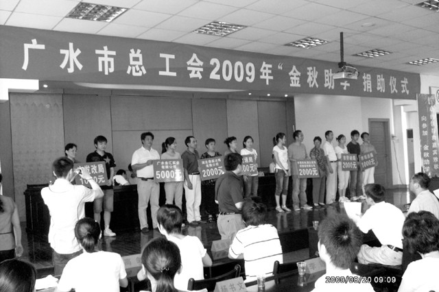 8月20日,广水市总工会2009年“金秋助学”活动启动。在捐助仪式上,该市56个单位向97名学生捐助了14.22万元助学金。受助贫困生表示,好好学习,以优异的成绩回报社会。 (袁华强 毛 俊摄)