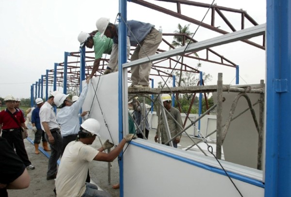 8月20日,大陆援助台湾台风“莫拉克”灾区的首批活动板房已运抵受灾严重的屏东县佳冬乡,当地工作人员已开始试装工作。 (新华社发)