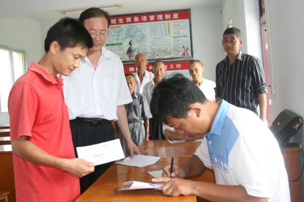 近日,随州国土局采用一折式发放补偿款,让补偿直接到农户手中。图为该局工作人员为农民发放青苗补偿费情景。