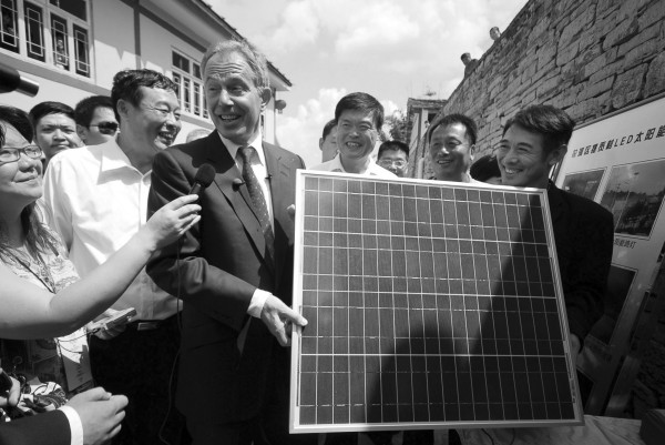 八月二十二日,英国前首相布莱尔(右四)与李连杰(右一)在贵阳市摆贡寨参观太阳能板。新华社发