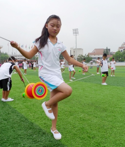 抖空竹是我国传统的杂技项目,集娱乐性、健身性、技巧性、灵活性、表演性于一体,深受人民大众喜爱。广水市“三五”俱乐部从外地引进这一体育运动项目,在中小学体育课上进行训练,受到了学生们的欢迎。图为广水市应办三小的学生在表演“抖空竹”。(本报记者 毛传荣 通讯员 熊本苏摄)