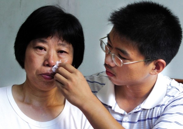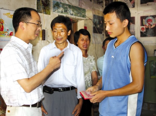8月24日,随城香港街开发商、康奈集团副总裁丁杏灿(左一)一行将1万元爱心资助款分别送到随县新街镇贫困学生孙鹏、童武阳手中。孙鹏(上图右一)家住新街镇墩子湾村二组,被湖北民族学院录取,其姐姐不久前因疾病去世,欠债8万多元。童武阳(右图右)家住新街镇居委会一组,其早年丧父,家庭拮据,今年被第三军医大学录取。当日,康奈集团副总裁丁杏灿将5000元资助款送到童家时,正为圆梦大学发愁的他们母子流下激动的泪水。(本报记者 杨闻名 通讯员 任小平摄)