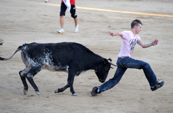 8月26日,在西班牙中部小镇圣塞巴斯蒂安,一名参与耍牛的男子躲避公牛的进攻。耍牛是西班牙另一种别有情趣的人牛之斗,目的不在于将牛杀死,而是靠闪躲、跳跃等方式戏耍公牛。 (新华社发)
