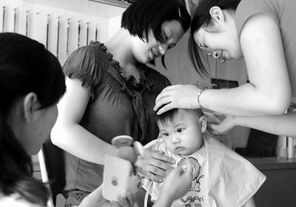 来自江西的黄为艳和黄音姐妹俩大学毕业后,依靠三万元小额担保贷款开始了自主创业之路。两人开办了一家经营婴幼儿个性纪念品的商店。她们推出的胎毛笔、胎毛画、水晶手脚印等产品受到许多家长喜爱。图为黄为艳(右一)为一名婴儿理发,以备制作毛发纪念品。新华社发
